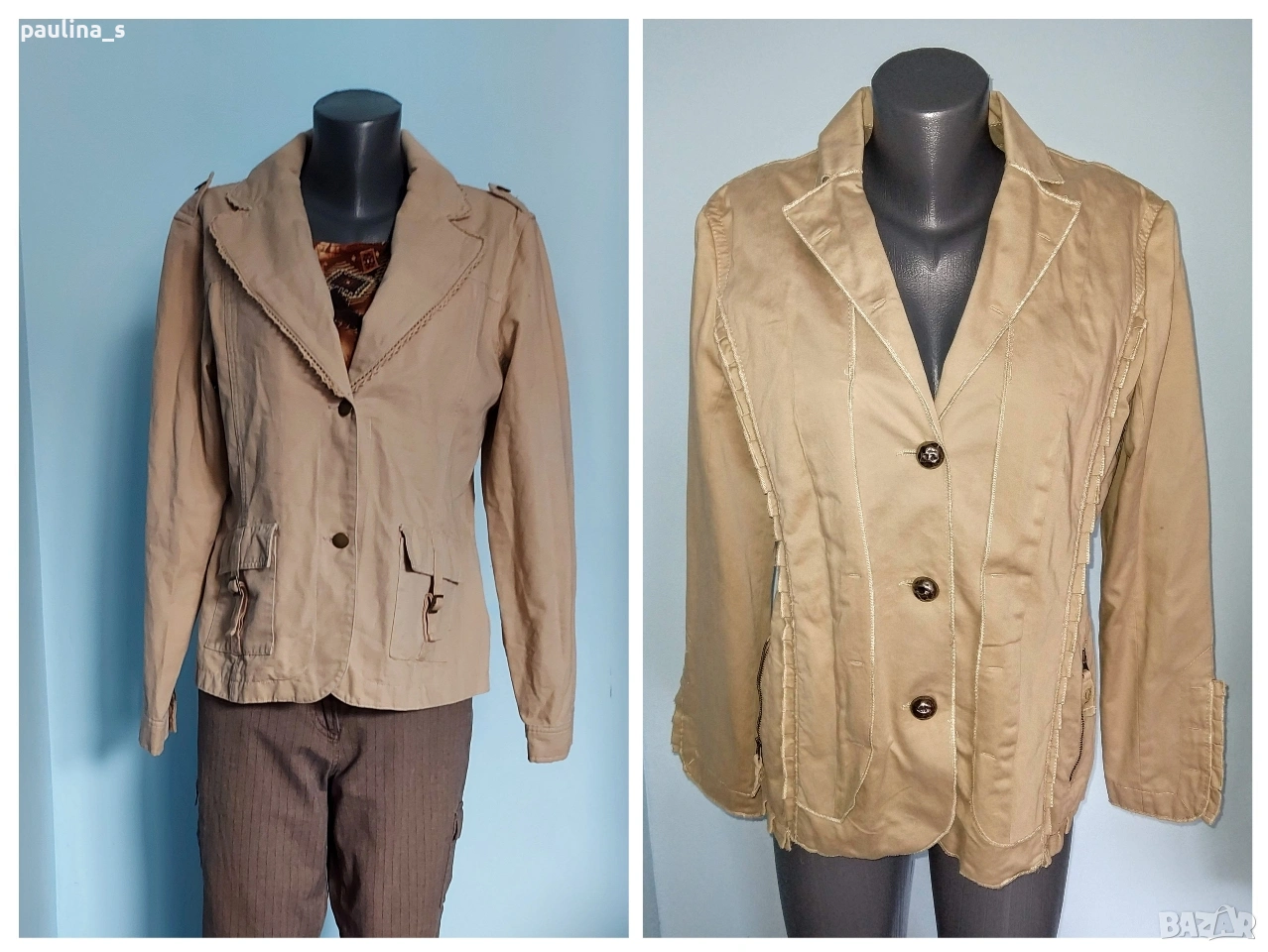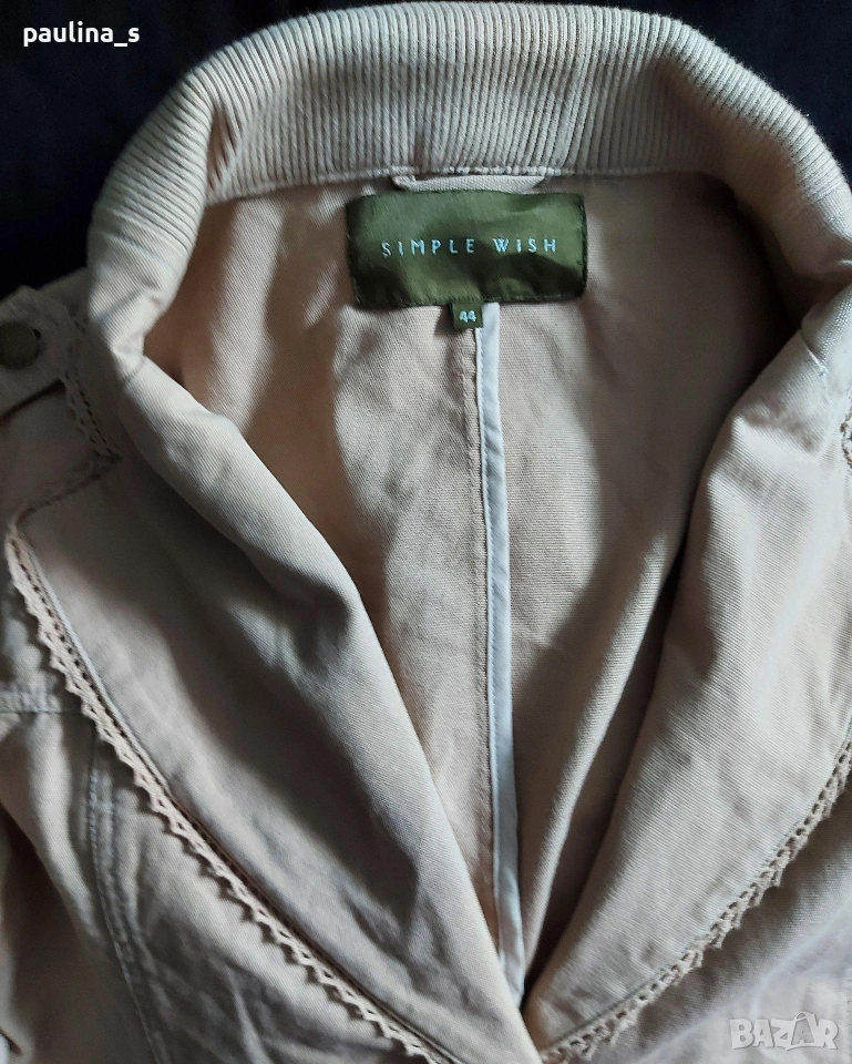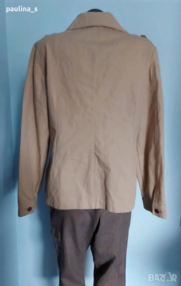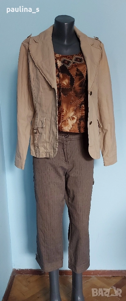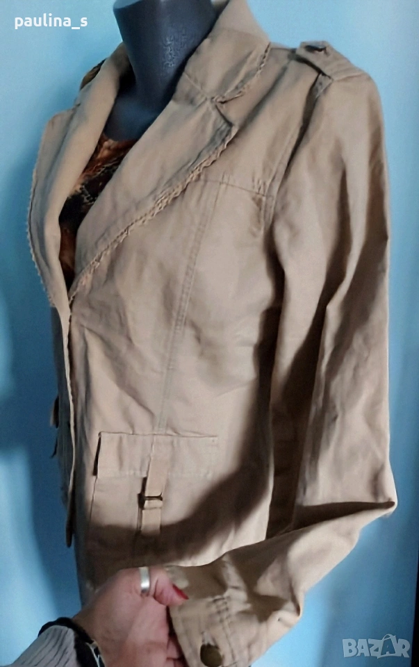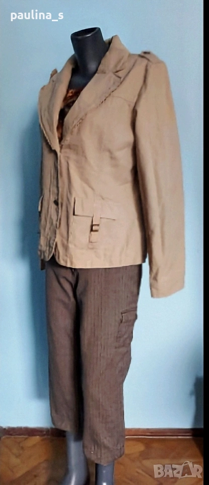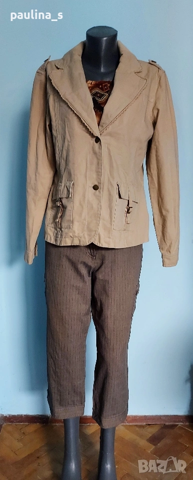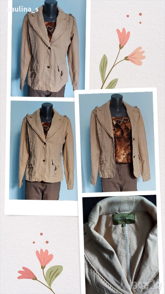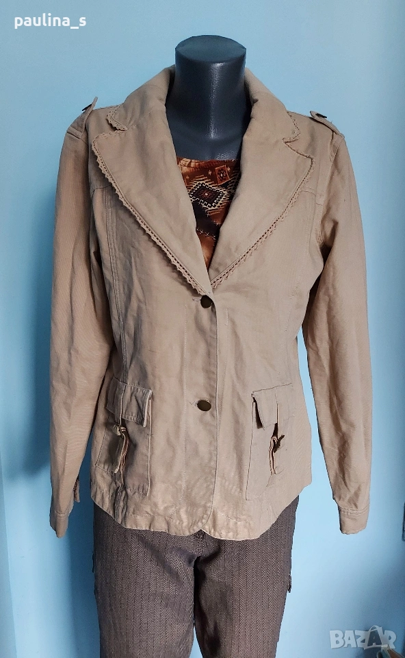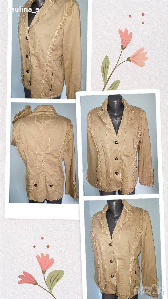 2️⃣. Колаж / L / 2XL - Уникално сако с детайли "Simple wish". Цената е крайна, без пазарлъци 20 евро. Уникално сако с детайли - дантели на реверите, рюшове на джобовете, еластична платка на яката. Материята е памук - мек, релефен и нежен за кожата - хипоалергична материя, цветът е Нюд / Охра, подходящ е за всичко топлата цветова гама. Силуетът е втален с издължена и заоблена долна задна част. Нова дреха, без забележки. Дънките и топът се продават в други мои обяви.
