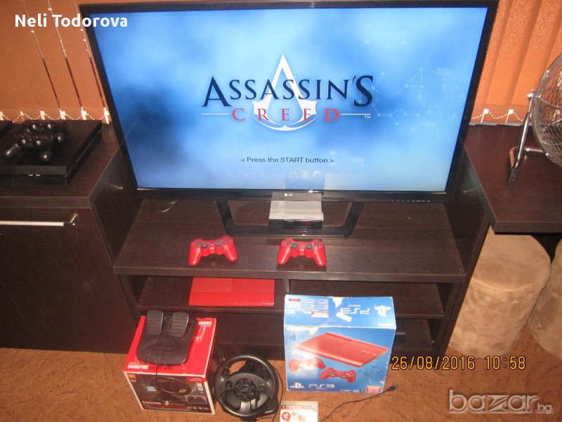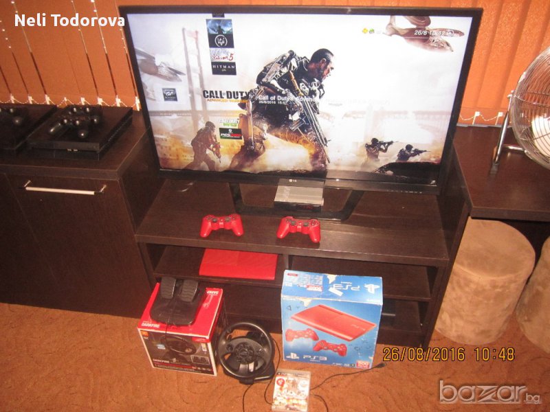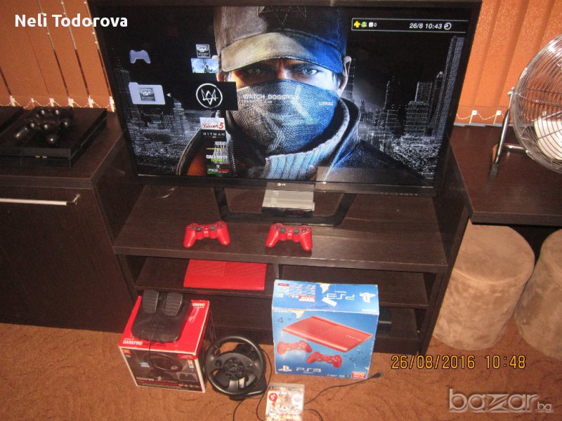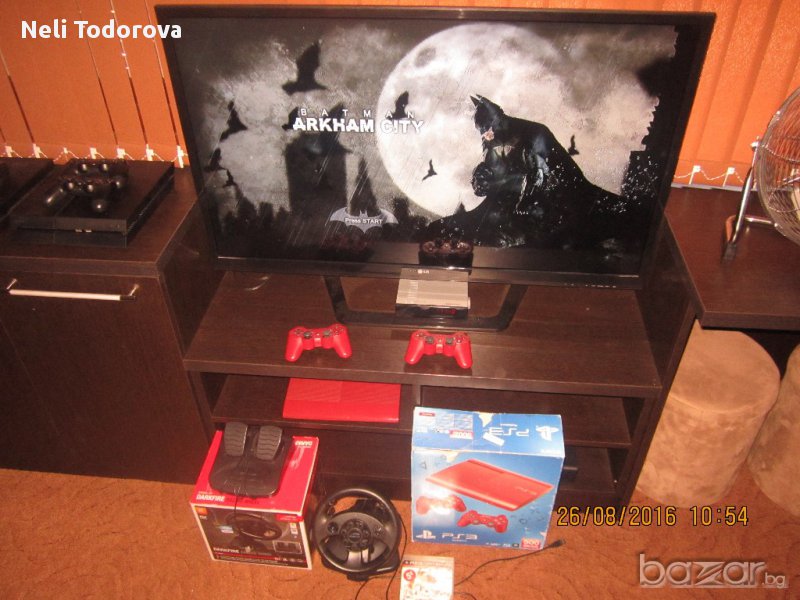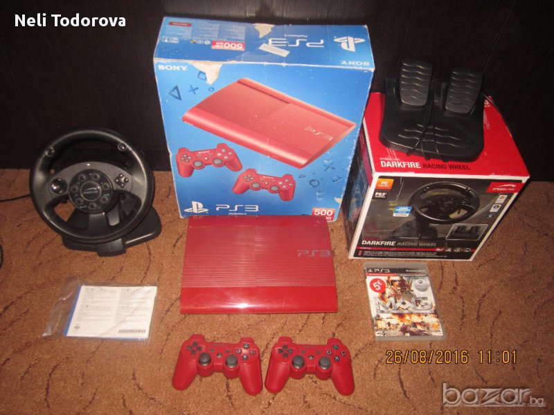 Конзолата е като нова ( с остатъчна гаранция от 9 месеца ) Последен модел производство PS3 500GB Slim ( най - добрият модел ) В комплекта има и уникален волан с педали - позволяващ ви да играете реалистично игри с коли . Към конзолата има акаунт с 20-тина хитови игри измежду които : FIFA16 , PES15 , NFS , Yakuza 5 , Assassins Creed , BATMAN , Watch Dogs , Call of Duty , Gran Turismo ,GTA , God of War и други. Ако желаете конзолата само с 1 джойстик цената е 250лв , за 2-ри джойстик се доплаща 30лв , за волана 45лв