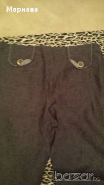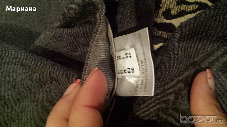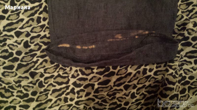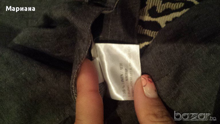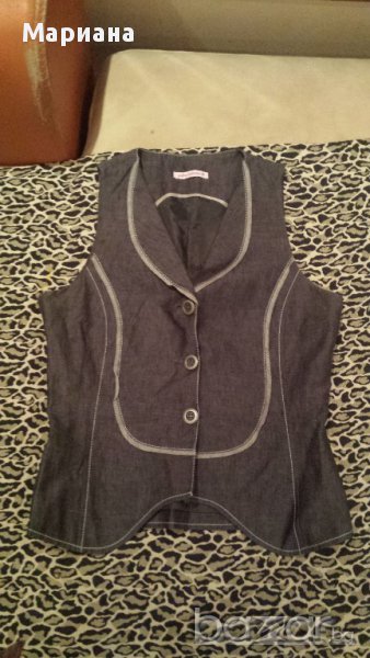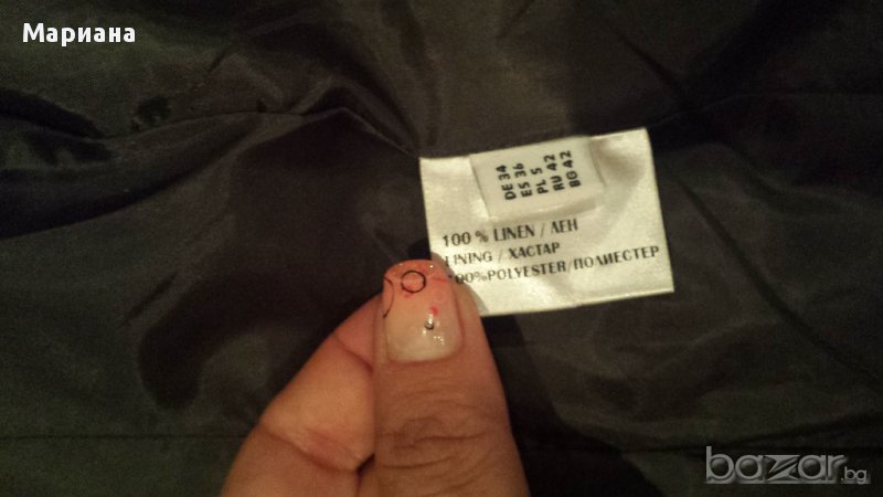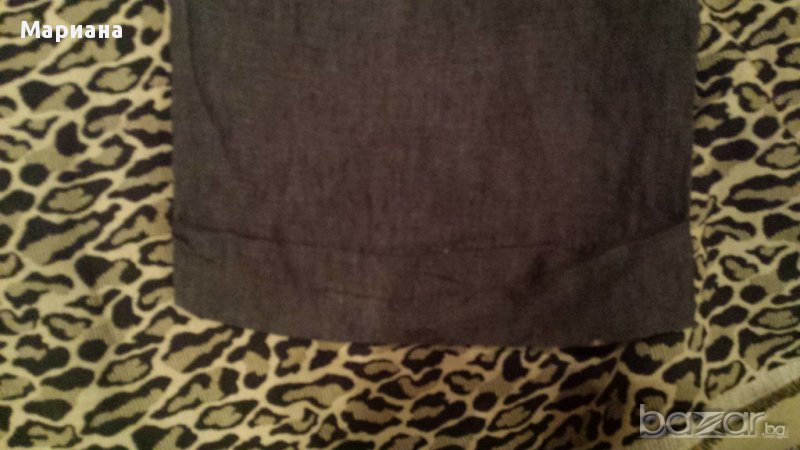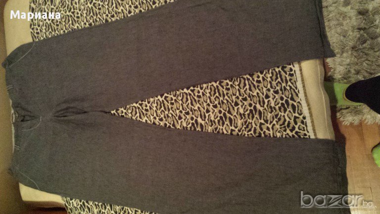 Пролетно-летен спортно-елегантен комплект от панталон и елек. Материята е лен. Единствената забележка е избелял подгъв на панталона, но той е от вътрешната страна и освен, че не се вижда, не се и забелязва.100% лен