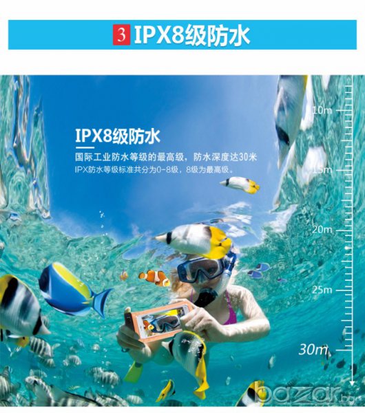 • Сертифициран калъф отговаря на стандарт IPX7 и редица международни стандарти с издръжливост до 30м под вода