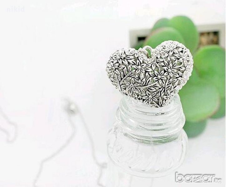 Колие с висулка голямо сърце на цветя ,сребрист цвят,ново