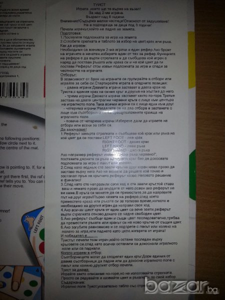 Мушама за под с размери-160см/136см, върху която се осъществява играта. Дъска със стрелка която показва на кой цвят трябва да се постави ляв, десен крак или лява,дясна ръка.Размери на кутията 27х27х5см.