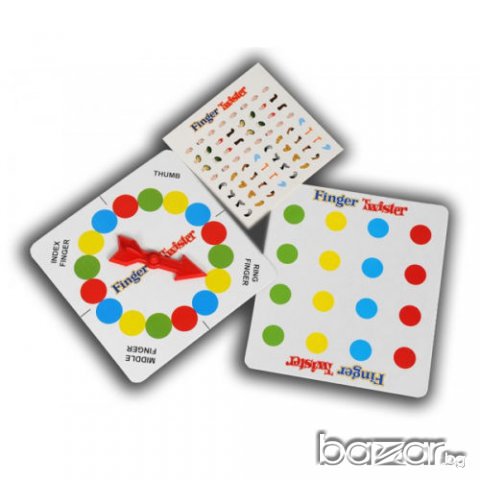 2.ДЖОБЕН TWISTER за пръсти. Сега вече можете да играете навсякъде и по всяко време Twister с приятел. Дори да пътувате в кола, автобус или влак - няма проблеми да играете на мини играта Twister за пръсти. Завъртете стрелката и тя ще Ви покаже кой пръст на кой цвят трябва да си сложите. Последният играч, който остане в играта е победител (тоест играчът, който не може да постави пръста си на цвета, на който трябва се приема за загубил).