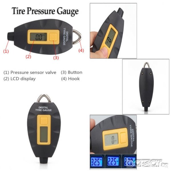Манометърът е лесен за четене с LCD екран, използва се за наблюдение на налягането в гумите, като по този начин удължава живота на гумата, увеличаване на горивната ефективност и осигуряване на Вашата безопасност. Той е подходящ за измерване на налягането на въздуха в гумите на автомобили, мотоциклети, колела и др.