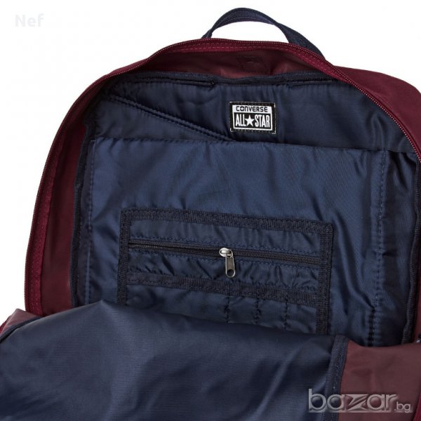 Компресирано основно отделение, затварящо се с двоен цип, вътрешно потплатено отделение и вътрешен джоб с цип за документи или цености, голям външен джоб с диагонален цип. Лого на CONVERSE в предната част. Подплатена задна част. Подплънки с регулируеми презрамки. Окачалка.
