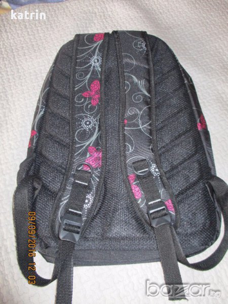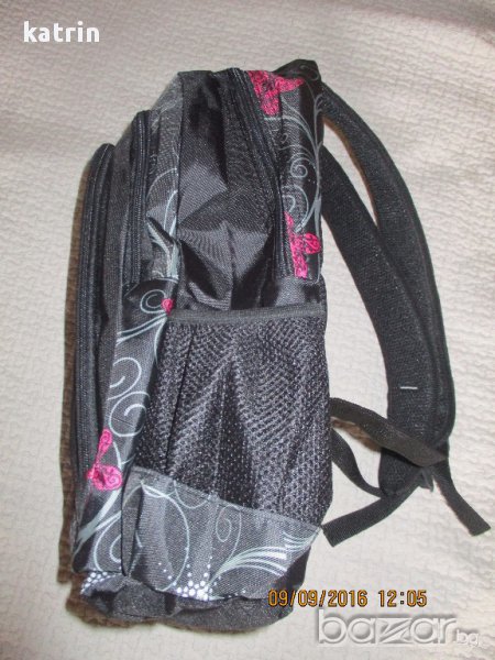 Раницата е съвсем нова, много хубава, голяма и удобна, подходяща за училище и не само. С 3 джоба с цип, отстрани има мрежа за шише.