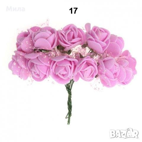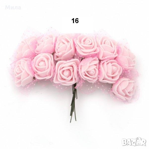 Изкуствени розички с тюл за декорация. Размер на цветчето - 2 см диаметър. Цена за едно букетче от 12 бр. розички - 0.90 ст. Налични цветове :