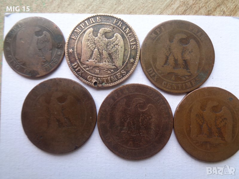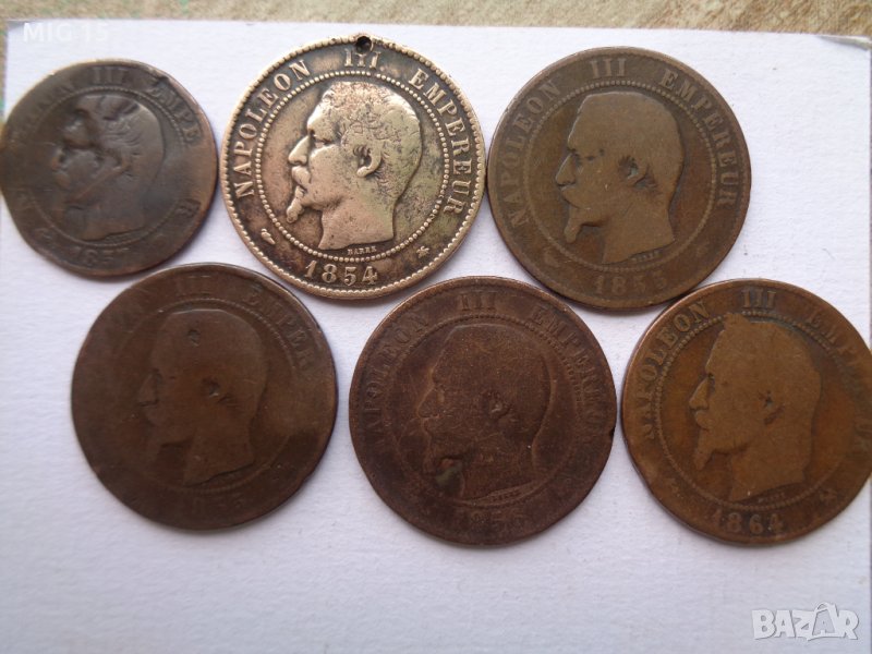 - Франция - 5 сантима 1857. 10 сантима 1854 (ПРОДАДЕНИ), 1855 (на снимката са два броя , но едната е продадена), 1856 (ПРОДАДЕНИ), 1864.