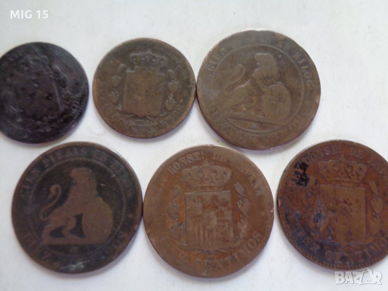 - Испания 5 центимо 1877,1879. 10 центимо 1870 (2 броя). 1877 (2 броя)