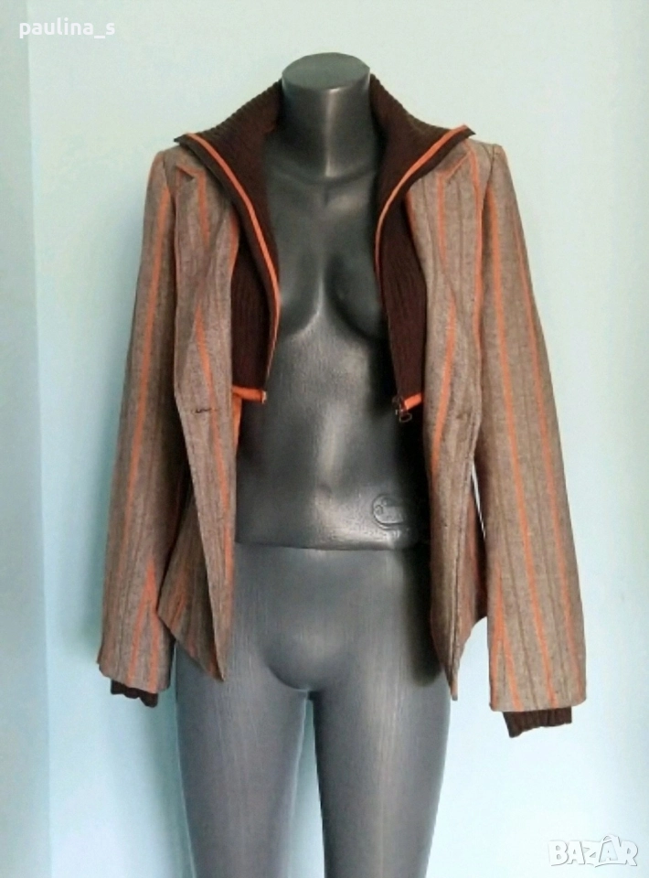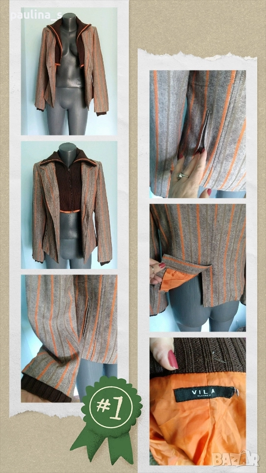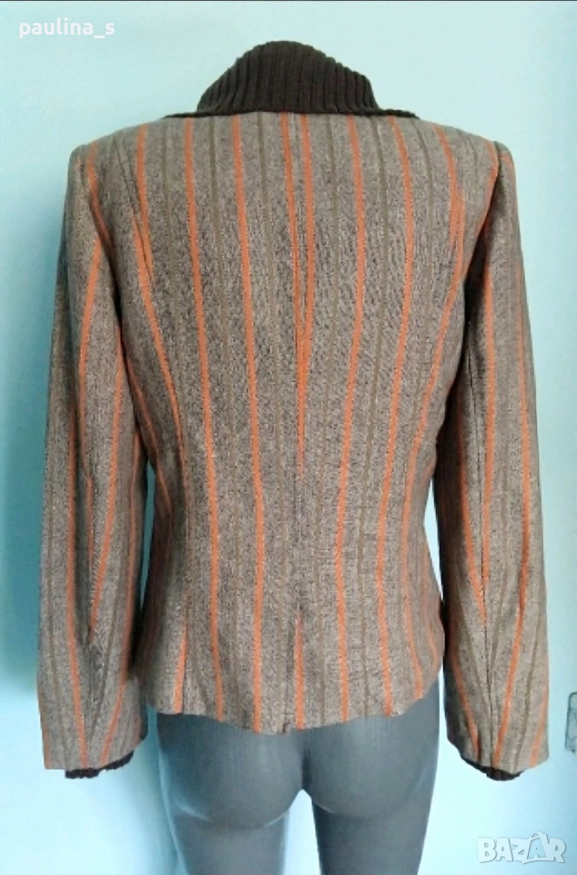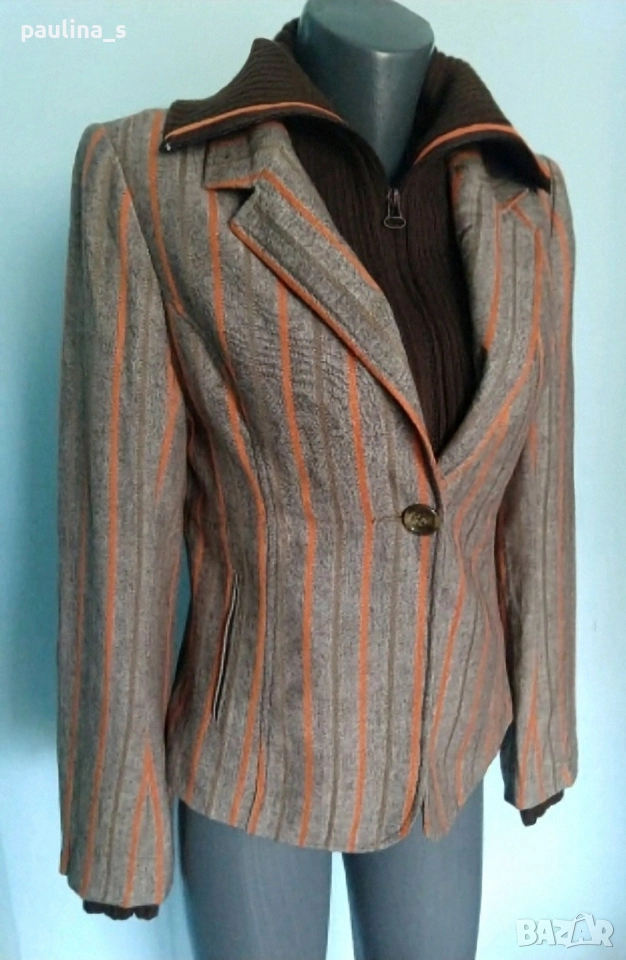 2️⃣ М / L - "Vila". Цената е крайна, без пазарлъци 29,99лв / 15 евро. Комбинирано вълнено сако с ревери и трикотажна яка на суичър, на ръкавите има допълнителен маншет от същото трико. Райетата са в оранжеви, като хастара. Нова дреха, филетките на джобовете са с фабричните тегели. Копчето е високо разположено, отзад има цепка. Платът е 35% вълна и 65% вискоза - топлъл и немачкаем. Сакото е подходходящо и за по-студено време. Перфектна дреха с оригинален аутлук.