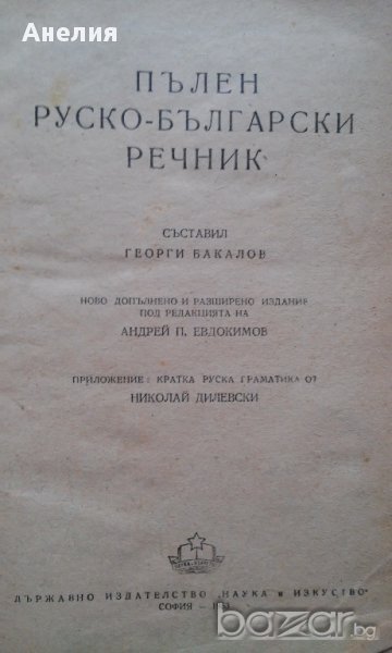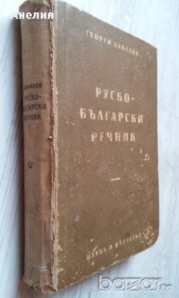 Много стар пълен руско-български речник, с приложение: кратка руска граматика /вж. снимките/. Речника е съставен от Георги Бакалов и авторски колектив, издателство "Наука и изкуство", София, 1953 г., 486 стр., твърди корици. С оригиналната си корица, има забележки по нея, с оглед годините на които е. По вътрешните страници няма забележки, нито скъсани и липсващи. Речникът е актуален и днес, така че спокойно може да се ползва от изучаващите руски език. Изпращам с "Еконт" през сайта с 10% отстъпка от цената за доставка. Може и със "Спиди".