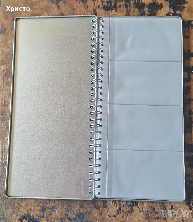 Снимки 12-14 : стабилен сребрист метал мат, метална спирала, размер 24,5х12,5 см, 4 реда визитки, за 120 визитки, - цена 10 евро