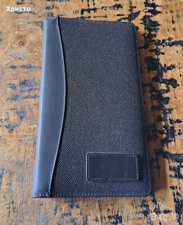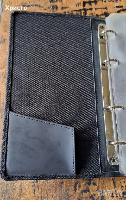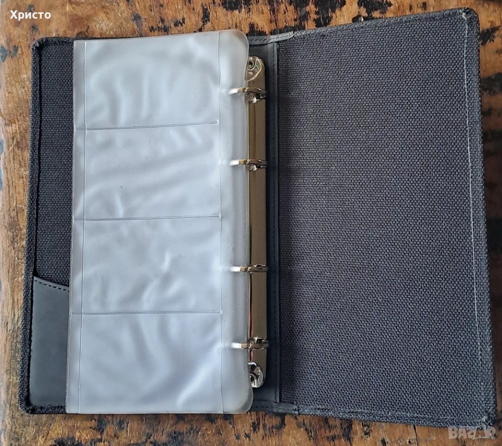 Снимка 3-5 : промазан качествен плат и еко кожа, размер 24х13,5х2 см, вътре е с 4 броя метални отварящи се рингове, 4 реда визитки, за 80 визитки, - цена 10 евро