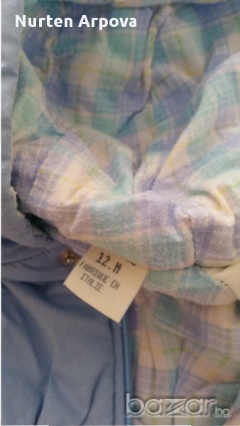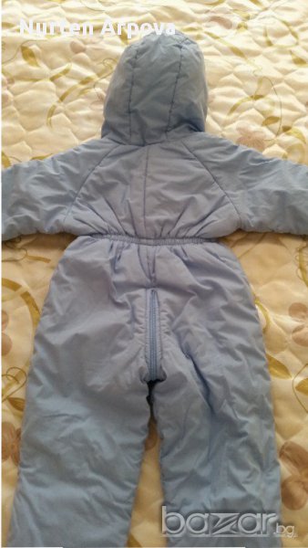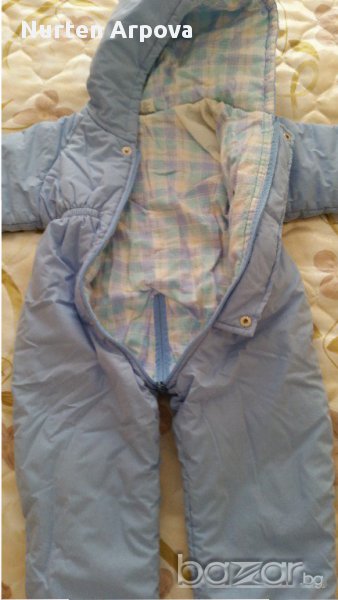 Много запазен. Без петна и скъсано. Светло син цвят. За дете на около 1-1.5г.Дължина на крачолките 30см. Ръкав 26см. От рамото до долу 70 см.