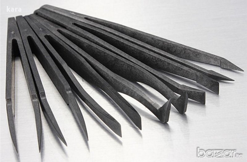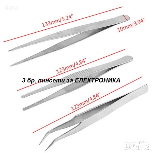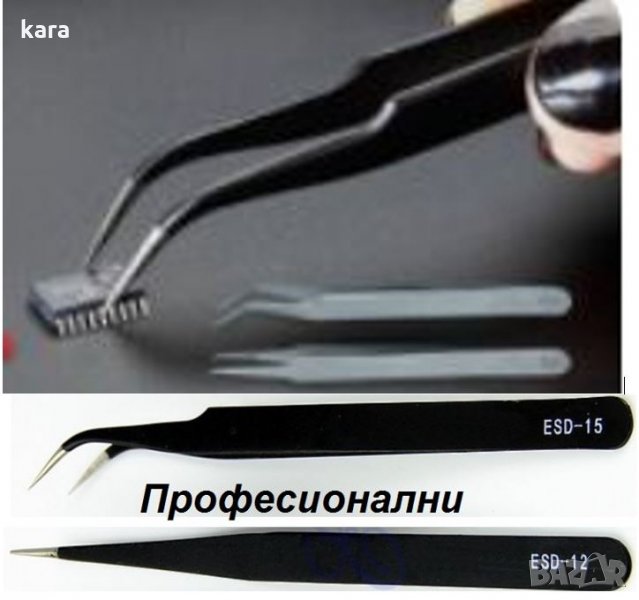 1. Комплект 6 броя антистатични пинсети - 14 лв Комплект от 6 броя пинсети с различна форма накрайници дължина 116мм. Изработени от полимерен PPS композит, поради което са черни, здрави, гъвкави, немагнитни, антистатични и термоустойчиви. Идеален за домашна употреба, за козметика, електроника и навсякъде, където е необходима прецизна работа с чувствителни елементи. 2. Комплект 2 броя професионални пинсети - 10 лв Пинсети ESD12 и ЕSD15 с права и извита заострени човки от неръждаема стомана с дължина 12 см. С антистатично черно покритие, много добра еластичност за професионална употреба в електрониката, както и за хоби употреба навсякъде, където е необходима прецизна работа с чувствителни елементи. 3. Пинцета за захващате тип чирак - 6 лв Перфектен многофункционален инструмент за професионално или домашно ползване от неръждаема стомана с дължина: 15 см. След захващане на целта получавате свободна ръка. 4. Комплект 3 броя пинцети за електроника - 12 лв Набор от три броя прецизни монтажни пинцети от неръждаема хром-никел стомана с универсално приложение в електротехниката, електроника,строителството и за домащно ползване. В гумирана опаковка. 5, Пинцета тип паяк за SMD елементи - 8 лв Пинсета за работа в електрониката с SMD елементи. Четирите пружинни нокти сигурно застопоряват произволни миниатюрни части. Прецизно изработен от алуминиева сплав, удобен ръчен инструмент и за хоби ентусиасти. Размер 115 х 10 mm