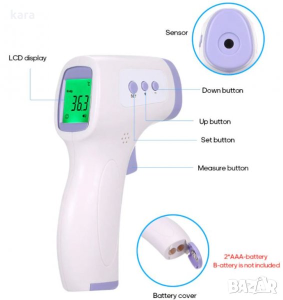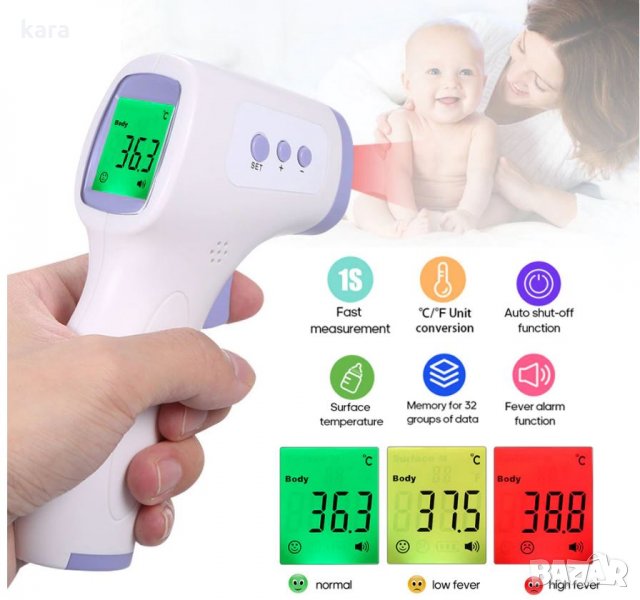Дистанционен термометър с висока точност за измерване на телесна температура, удобен за COVID 19. Безконтактна IR (инфрачервена) технология на измерване. Голям LCD дисплеи с трицветна подсветка. Ергономичен дизаин и удобен бутон за измерване.Възможност за настроиване на пределна температура.При измерване на по-високи стоиности от дефинираната пределна температура, термометърът издава звуков сигнал. Автоматично изключване на устроиството. Индикатор за слаб заряд на батериите.Избор на мерна единица: C / F. Обхват на измерване: 32 C -42.5 C. Точност: 0.1C. Отклонение: 0.2 C. Ефективно разстояние за измерване:30 мм – 50 мм. Програмируема Трихроматическая Подсветка: 32 - 37,2 С зелен, 37,3 С - 38 С жълт; 38,1 С - 42,9 С червен.