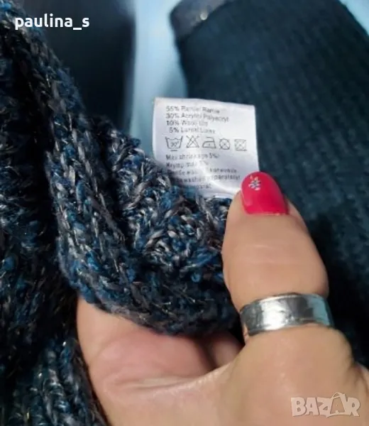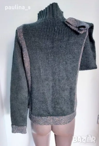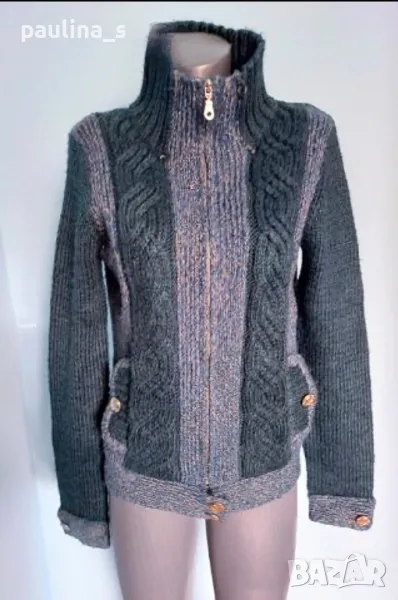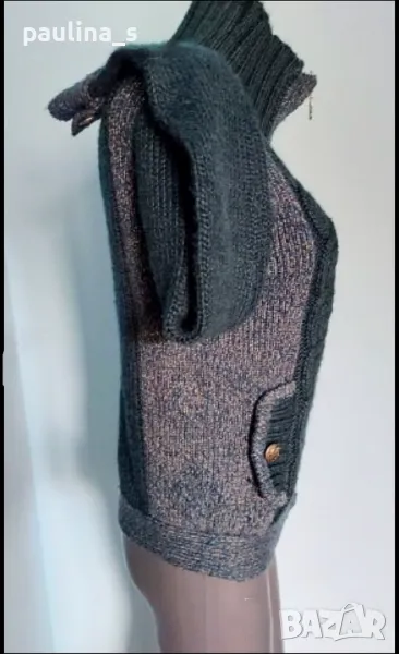 Уникална блестяща жилетка, една бройка е. Цветът е маслено зелено, много актуален. Закопчаването е цип и оригинални метални копчета. Съставът на преждата - 55% рами, вълна и примеси. Отпред е декорирана с капаци и копчета. Преждата е със съдържание на вълна, рами и акрил, не боцка, приятна е на допир до кожата. Без дефекти, като нова.