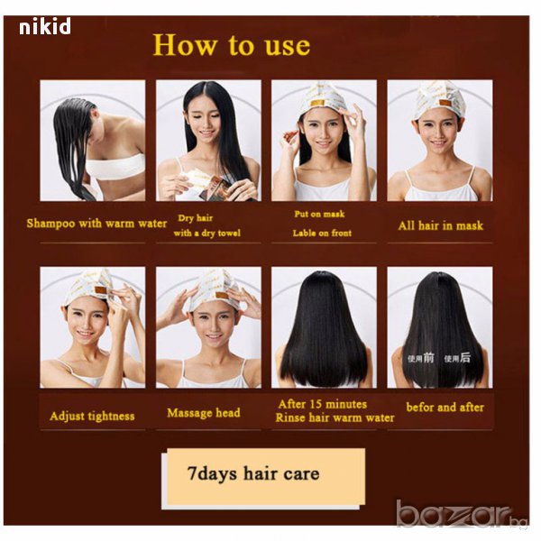 След измиване на косата с шампоан, подсушете с хавлия и поставете маската,която е в ШАПКА,готова за употреба,оставете да подейства 15 мин.,след което изплакнете.Гарантиран резултат поне 7 дни.
