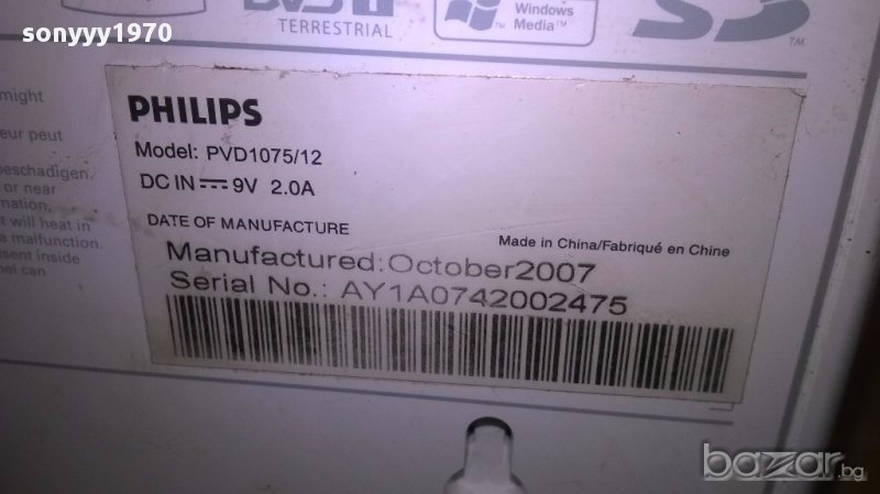 Philips pvd1075/12 tv/dvix/dvbt/usb/sd-работи на 9в-внос швеицария