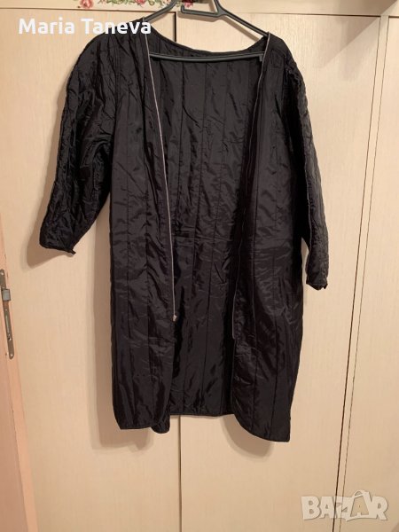 Дамско манто от черен непромокаем плат, с подплата, която е подвижна. Може да се носи и като шлифер /без подплатата/ при дъждовно време. Дължината на мантото е 115 см, ръкавите са дълги 58 см, а в раменете ширината е 51 см. Мантото има басти и достатъчно ширина и може да се носи върху сако или жилетка. Освен,че е непромокаема материята е и защитаваща от ветрове. Дрехата е топла и многофункционална, през трите сезона може да се ползва.