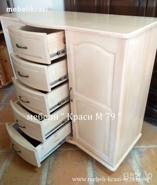 Скрин с 5 извити чекмеджета и 2 врати-масив. Скринът е изработен изцяло от естествено дърво /Бял бор/в естествен цвят.