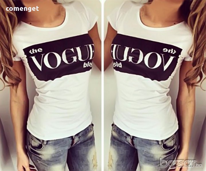 Дамски топ VOGUE със стилен FASHION дизайн! Разполагаме с всички размери от S до 2XL! В наличност 10 ЦВЯТА! Тениските са изработени от 100 % памук с нова печатна технология!