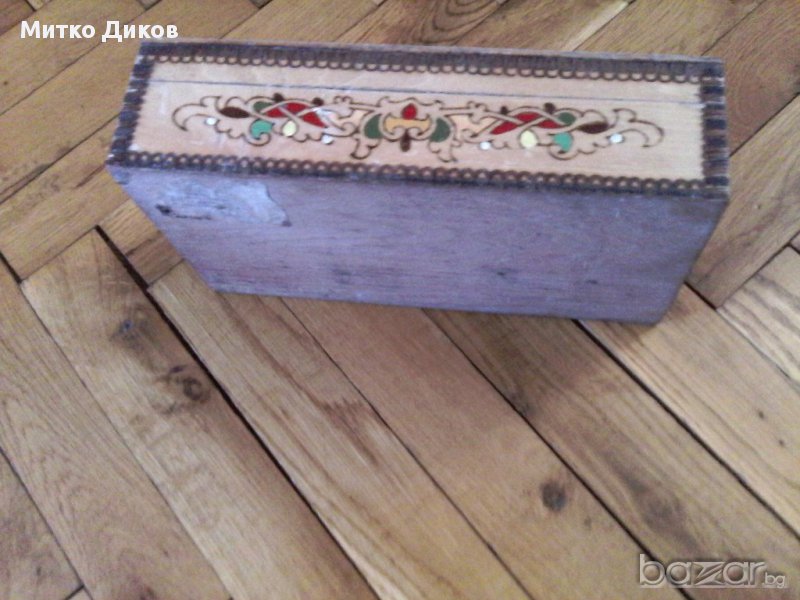 Кутията е използвана много стара но в много добро състояние видно от снимките размери 22см на 12см на 6см пирографирана-изпращам по еконт с отстъпка