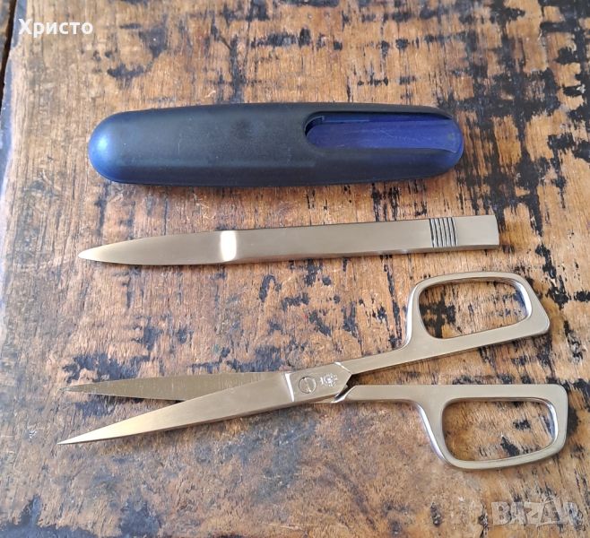 ножица и нож за отваряне на писма комплект Хенкелс Henkels Aachen Design Германия син прозрачен. Произведен в Германия. Размерът на комплекта е 20x6.4x2.2 см, дължината на ножът за писма е 16,8 см, ножицата е с дължина 19 см. Комплектът е оригинален, масивен, тежък и надежден, рядък, не е използван. В оригиналната кутия, която има леки зацапвания от долната страна. Кутията е с размери 25х8.2х3.5см. Уникати, от частна колекция. За ценители.