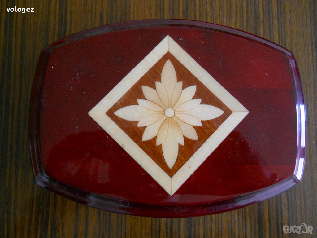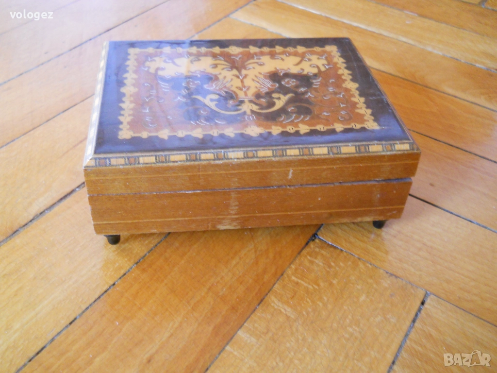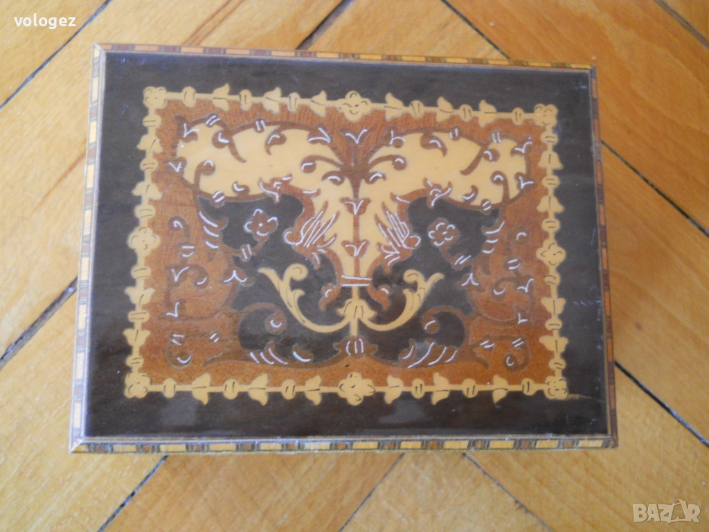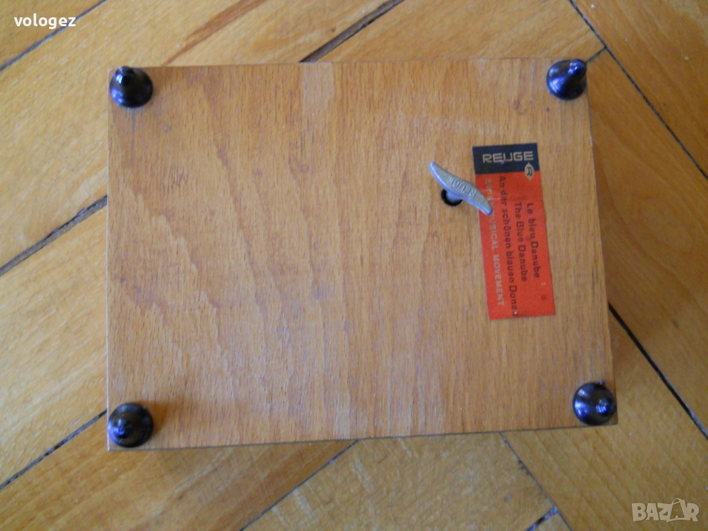 Винтидж дървена швейцарска музикална кутия "Reuge" с декоративни инкрустации в стил Соренто. Изпълнява мелодията "Синият Дунав" (The Blue Danube / An der schönen blauen Donau). Произведена е в края на 50-те години на миналия век.