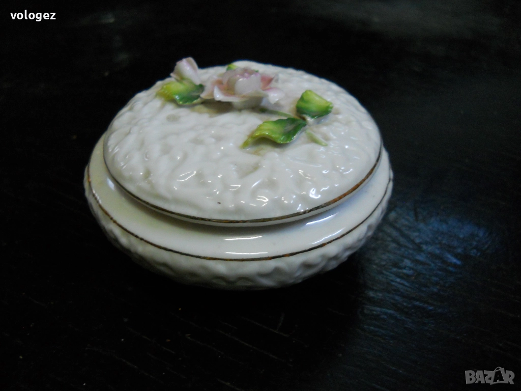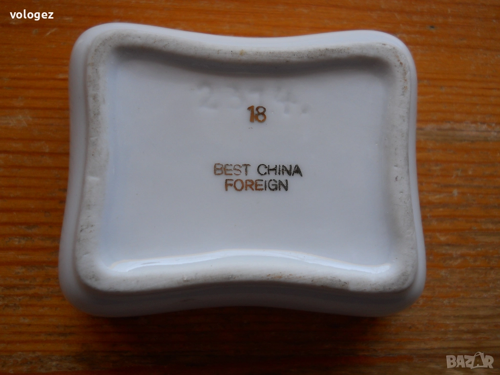 Порцеланова кутийка за бижута, маркирана с надпис "GENUINE PORCELAIN FOREIGN". Надписът указва, че продуктът е изработен от истински порцелан и е внос.