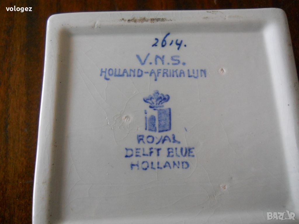 Маркировката на дъното показва, че кутията е произведена от фабриката Royal Delft, известна и като De Porceleyne Fles - основана през 1653 г. Надписа "V.N.S. HOLLAND-AFRIKA LIJN" показва, че артикулът вероятно е произведен за корабоплавателната линия Holland-Afrika Lijn (Holland Africa Line), създадена през 1921 г.