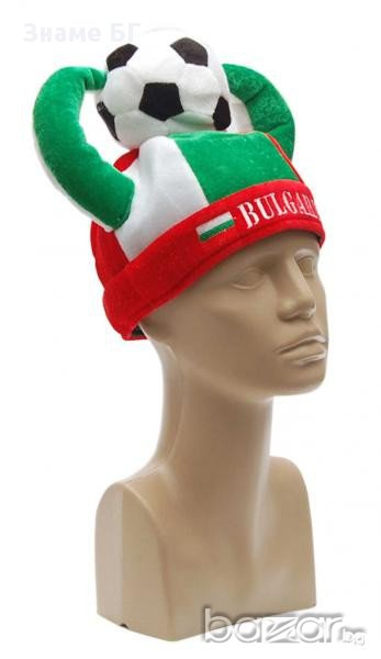 Карнавална шапка с рога и футболна топка. Шапката е в цветовете на българския трикольор. Подходящ аксесоар към карнавален костюм.