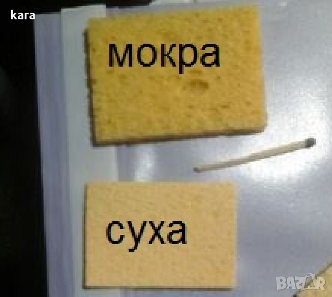 почистване човката на поялник от окиси и замърсявания.Преди употреба намокрете гъбата с вода, тя се раздува и тогава изтрийте човката на загретия поялник в гъбата. Притежава силно смукателно действие, неутрализира оловните окиси и мръсотии. При много замърсена и корозирала човка навлажнете с разтвор от нишадър.