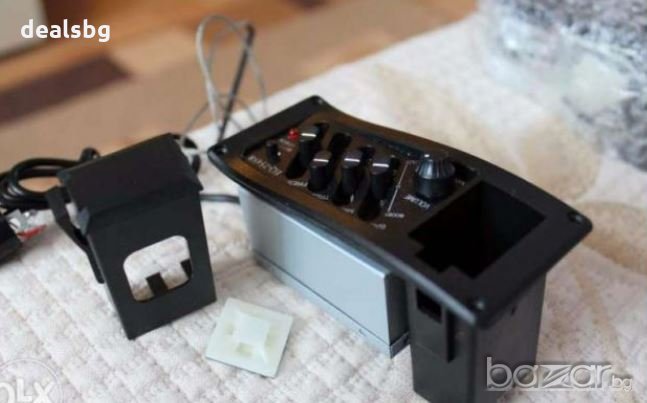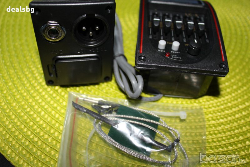 Предусилвател за акустична китара. Контрол силата на звука, +5 ЕКВАЛАЙЗЕРА+ ВГРАДЕН ТУНЕР ЗА НАСТРОЙКА.Пиезо адаптера се залепя под магарето(най-добре). с ДВА ИЗХОДА Е. Захранва се с 9V батерия (не е включена в комплекта).Чисто нов е. Комплекта си идва с всички части за поставянето.Цена: 48.00 лв.
