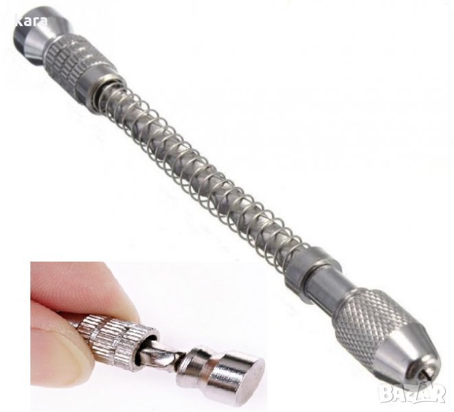 Дрелката е на принципа на Архимедов винт с пружинен механизъм за задвижване. Перфектна за пробиване на дърво, бижутерийни изделия, пластмаса, финни отвори в платки и други материали. Дрелката е изцяло с метален корпус, с накатки на местата за хващане при работа. В комплекта са включени 5 броя свредла от 0.6 до 2 мм . Размерите на дрелката - 115 х 15 мм.