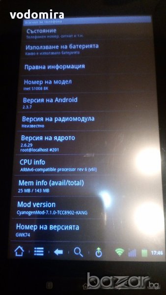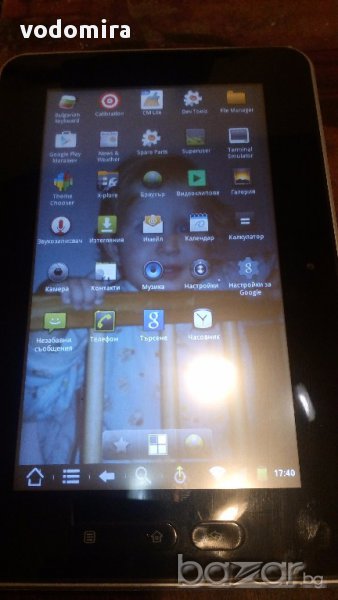 Таблета е много стар , работи , но става повече за детска играчка, за четене на ел. книги или за слушане на музика. Видеото върви на по някой път звука изчезва. За браузаруване не е удобен защото зарежда много бавно страниците. Флашнат е и е с CyanogenMod 7 (gingerbread/2.3.7) and ClockworkMod Recovery 5.