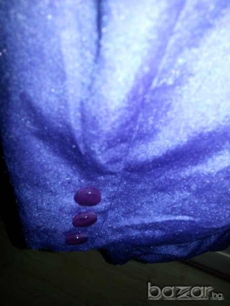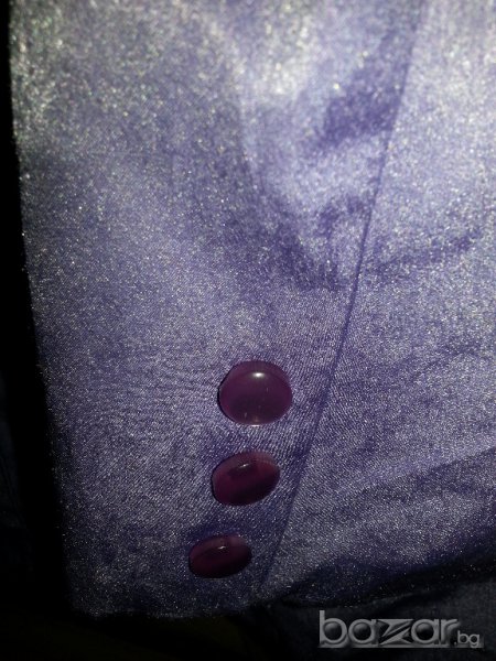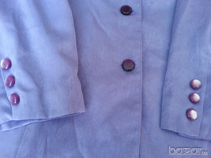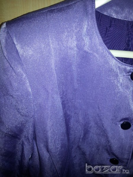 Дамско пролетно лятно сако от сатен, тънък плат с подплата, много приятен лилав цвят, предни джобове, копчета със същия лилав цвят, № 44-46, измерено отпред бюст около 50 см от мишница до мишница, талия 48 см, ханш 56 см и се разширява надолу до ръба на сакото 58 см, дължина 70 см. Сакото е като ново, малко е ползвано. Отговарям на съобщения тук, изпращам с куриер с отстъпка, преглед и тест, или лично предаване в София.