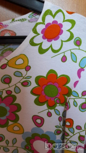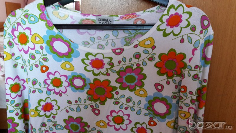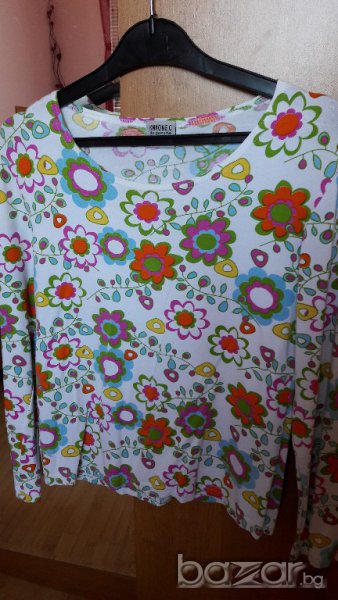 Дамска блуза с дълъг ръкав, с 5 % еластан, цвят бял с ярки цветни фигурки, размер № 42-44, бюст 40 -44 см /обиколка 80-до 88см се разтяга/, дължина 50 см. Отговарям на съобщения тук, изпращам с куриер с отстъпка, преглед и тест, или лично предаване в София.