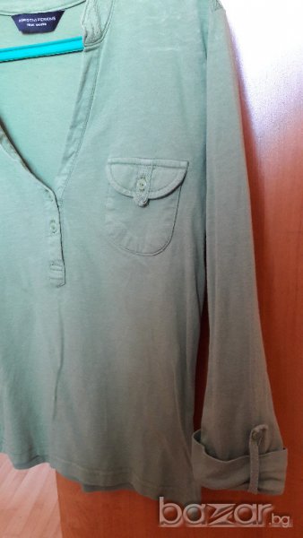 Дамска памучна блуза средно дълъг обърнат ръкав с копче, триъгълно деколте, с джобче отпред с копче, пролетно-резидав цвят. Размер М бюст 44 см отпред /или обиколка 88 см/. Отговарям на съобщения тук, изпращам с отстъпка, преглед и тест, или лично предаване в София.