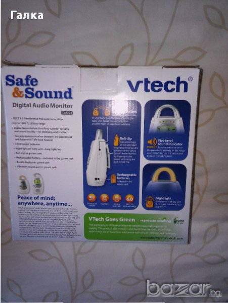 Бебефона е с лет индикатор, с вибрация, до 300м покритие Едното устройство може да се ползва като нощна лампа. Без камера e. Всяко устройство си има адаптер.