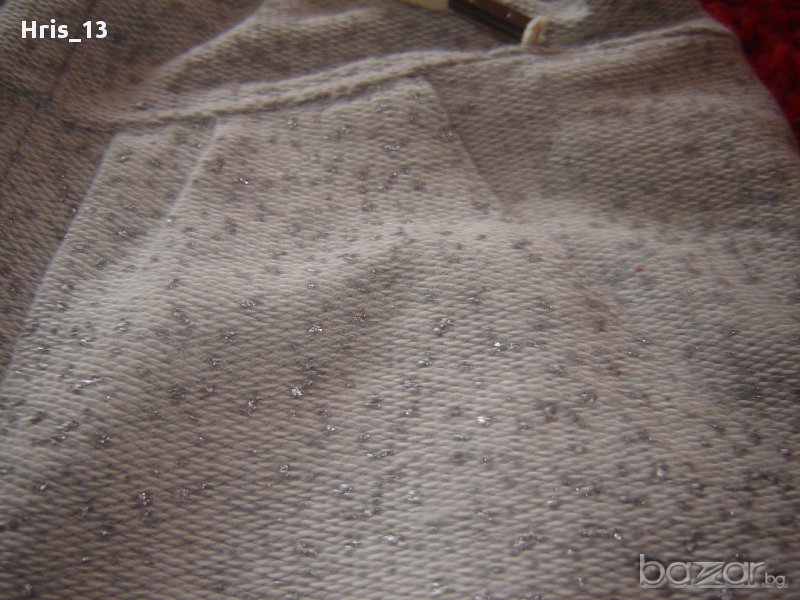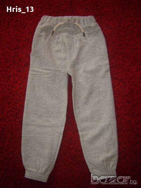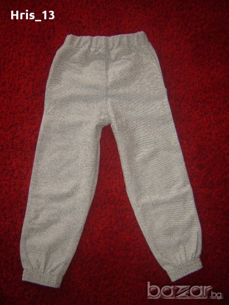 Ново спортно-елегантно панталонче, с блестящи точици по него, 85 % памук и 15 % полиестер, закупено от www.abubu.bg. По етикет е за 5 години, но според мен е за 3-4 г., дължина - 58 см, талия - 20-25 см (неразтегната и разтегната ширина).