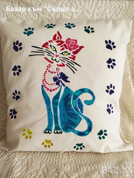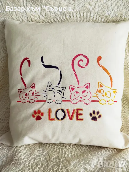 Снимка 5 и 6 Котки върху памучна калъфка за възглавница - 20 лв; 41 х 41 см. Пране на 30 градуса, гладене от обратната страна