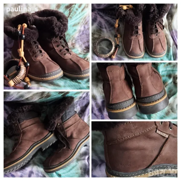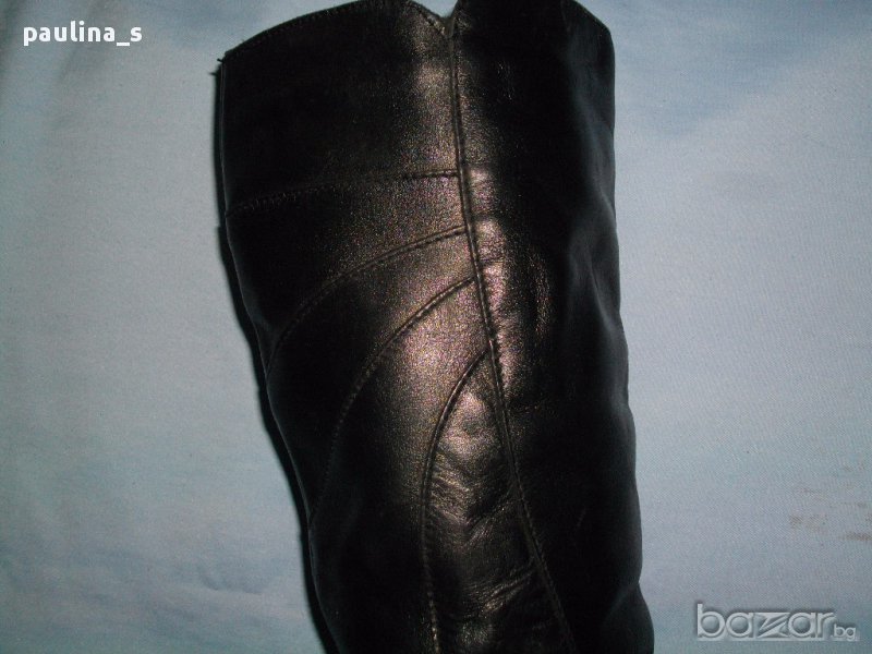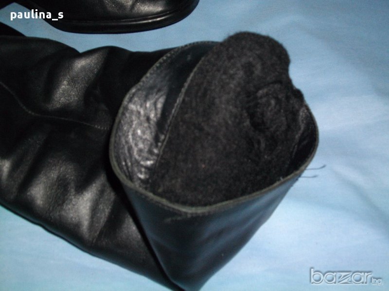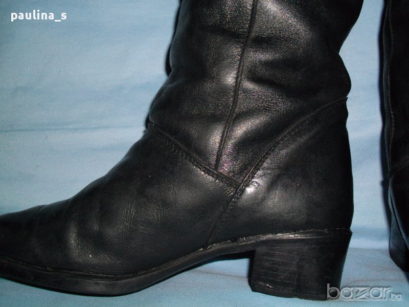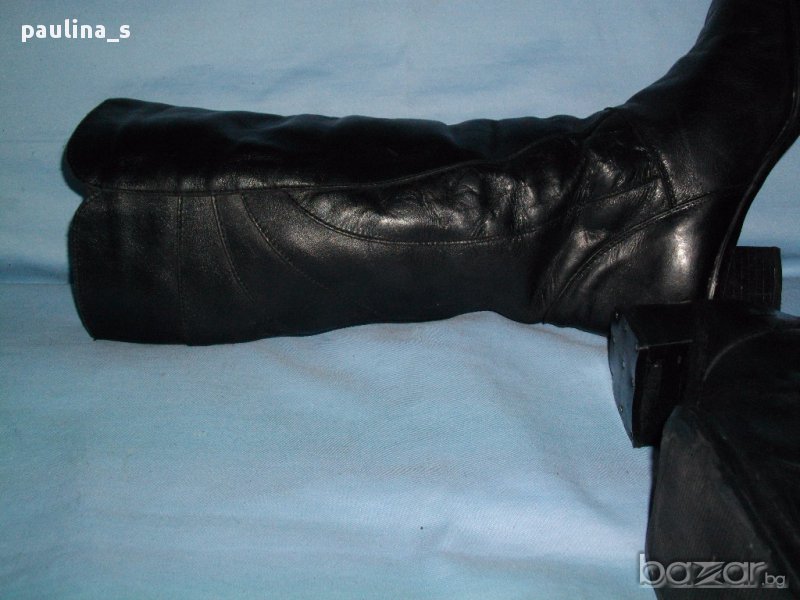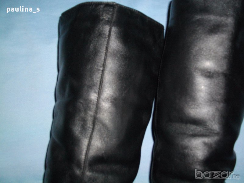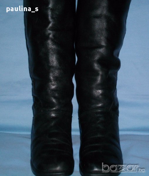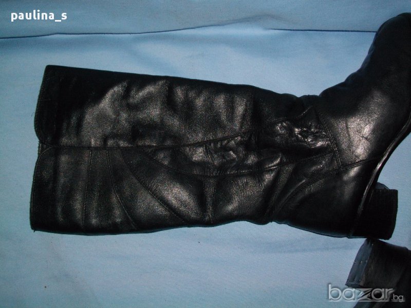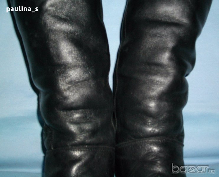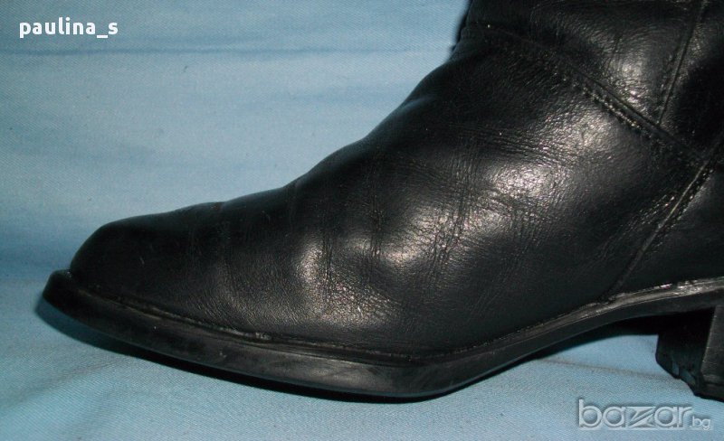 Дамски маркови ботуши от естествена кожа, тока е ремонтиран на обущар, в перфектен вид. Отвътре са с пухен хастар, изключително топли и удобни за сезона. Кожата е мека и еластична, здрава, нямат никакви забележки! Стелка 24см, глезен 30см, прасец 36см, горе 38см, дължина 33см