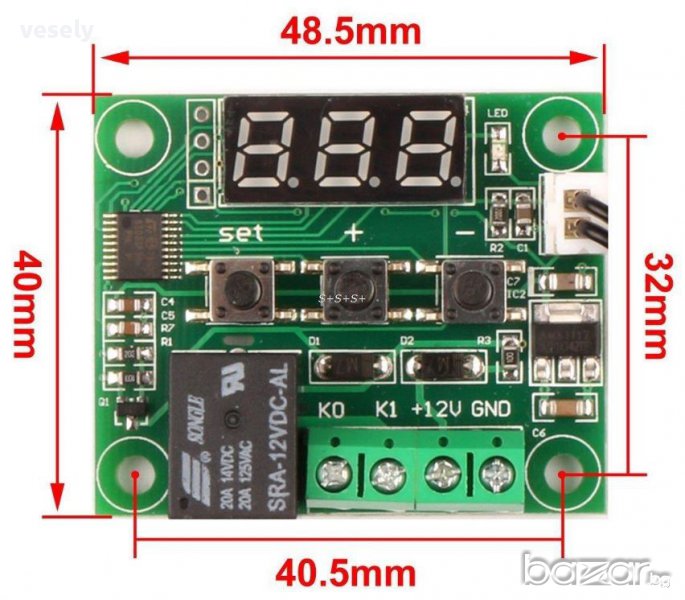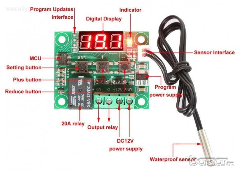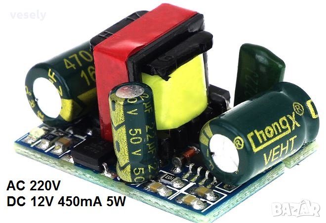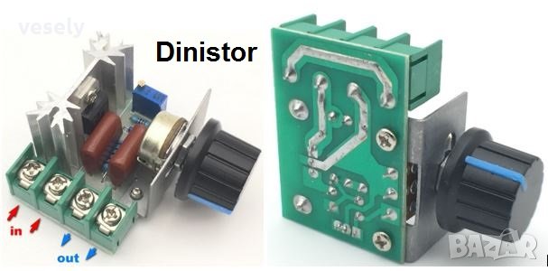 1. Домашен термостат W1209 - 18 лвДомашния термостат е незаменим във вашето домакинство. С този програмируем регулатор на температурата ще може да управлявате автоматично вашия климатик, вентилатор, фурна, фризер, аквариум, солариум, инкубатор, ел.печка и всичко, което се нуждае от контрол на температурата. Може да го използвате и навън, в производствени помещения за управление на температурни процеси. Принципът на действие е прост – с двата десни “+” и “-” от трите бутона под цифровия дисплей настройвате долна и горна граница на температурата, която се следи с температурната сонда NTC (10 К 0.5%). При достигане на някоя от тези граници се включва или изключва реле, към което е присъединено вашето устройство (климатик). С третия бутон “SET” микроконтролерът се програмира за 7 различни режима на работа: P0- cooling/heating; P1-хистерезис; P2- горна граница на поддържаната температура; P3- долна граница на поддържаната температура; P4-корекция на температурата; P5-задръжка на времето ON/OFF на релето; P6-горна граница на температурата за изключване (защита от прегряване).Технически характеристики на W1209: Размери-48*40 мм; Kонтрол на температурния режим: ON/OFF; Диапазон на работната температура: от -50 до +110 градуса; Разрешаваща способност .1;Точност на управлението: 0.1; Точност на гистерезиса: 0.1; Чeстота на отчитане: 0.5 S; Защита от висока температура от 0 до +110; Напрежение на захранване: =12 V; Консумация статична: ≤ 35mA, при задействано реле ≤ 65mA; Изходяща мощност на релето: 220V/10A: Измервателен вход: Водонепроницаем Датчик NTC (10 К 0.5%); Eкологични изисквания: от -10 до + 60; Влажност 20%-85%. И още -управляващия електрод не е термодвойка, а терморезистор. Благодарения на миниатюрния размер може да се залепи практически на произволен корпус, което ви позволява да контролирате критични части от вашия двигател, машина,скъпа техника.2. Динисторен регулатор 220V / 2KW - 12 лвВключете тази платка последователно с лампата на осветлението или произволна битова апаратура и въртете копчето за затъмняване или управление на скорост, температура, напрежение и т.н. Може да управлявате променливотокова мощност до 2000 вата.Да управлявате ел.печка, котлон, водонагревател, лампи, ел.мотори, бормашина, ел.ютия, вентилатор и всичко което е на 220 V в домакинството Ви. Регулируемо напряжение: 50-220 В AC. Размер ок. 48 х 54 х 27 мм. Материал: пластик, металл3. Димер DC Контролер - 14 лвДимерът 12 В 8А се използва за регулиране на силата (яркостта)на светлината при ЛЕД осветление (лед ленти , крушки и др. ) меко и стабилно без трептене или мощността на постояннотокови устройства. Захранващо напрежение: DC 12V-24V Максимален ток нанатоварване:8A; Изходна мощност:12V 4. Миниатюрна захранваща платка 220V/5V 700mA - 10 лвAC/DC конвертор 220V/5V (+- 0.2V) 700mA 3.5W с размери 30 x 20 x 18 mm. Модулът е с пълна автоматична защита от температура, претоварване и късо съединение. Идеален както за промишлени, така и за любителски приложения “направисам“. 5. Миниатюрна захранваща платка 220V/12V 450mA - 10 лвAC/DC конвертор 220V/12V (+- 0.2V) 450mA 5W с размери 30 x 20 x 18mm. Модулът е с пълна автоматична защита от температура, претоварване и късо съединение. Идеален както за промишлени, така и за любителски приложения “направи сам“.