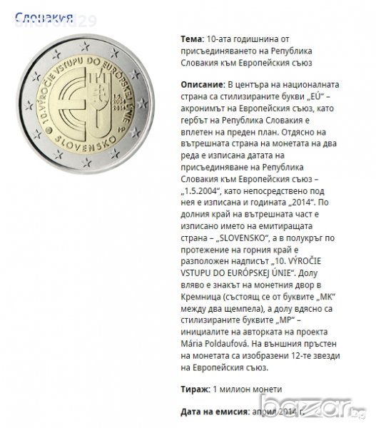 2014 8 Словакия 2 EURO / 10-та годишнина от присъединяването към ЕС 8.80 лв./4.50 €
