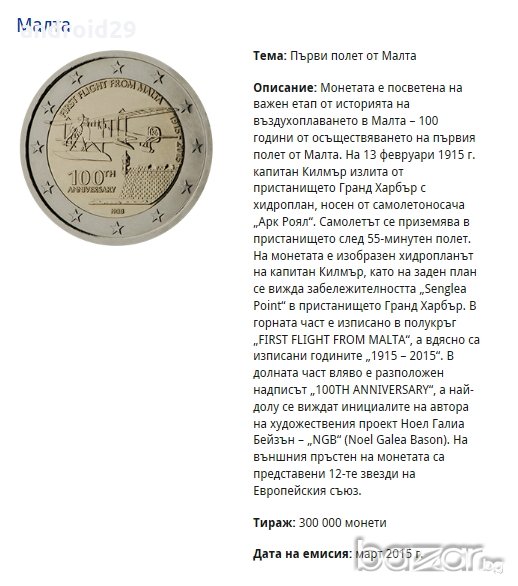 2015 16 Малта 100 години от първия полет на Малта 21.60 лв. /11.04 €