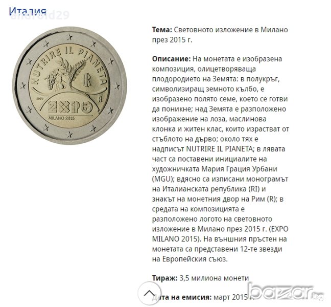 2015 20 Италия Световното изложение в Милано (Expo Milano) 11.00 лв. /5.62 €