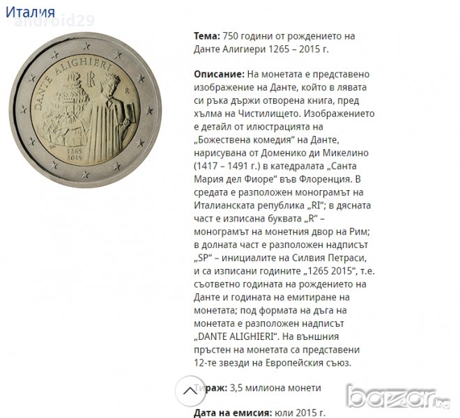2015 19 Италия 750г от рождението на Данте Алигиери 11.00 лв./5.62 €