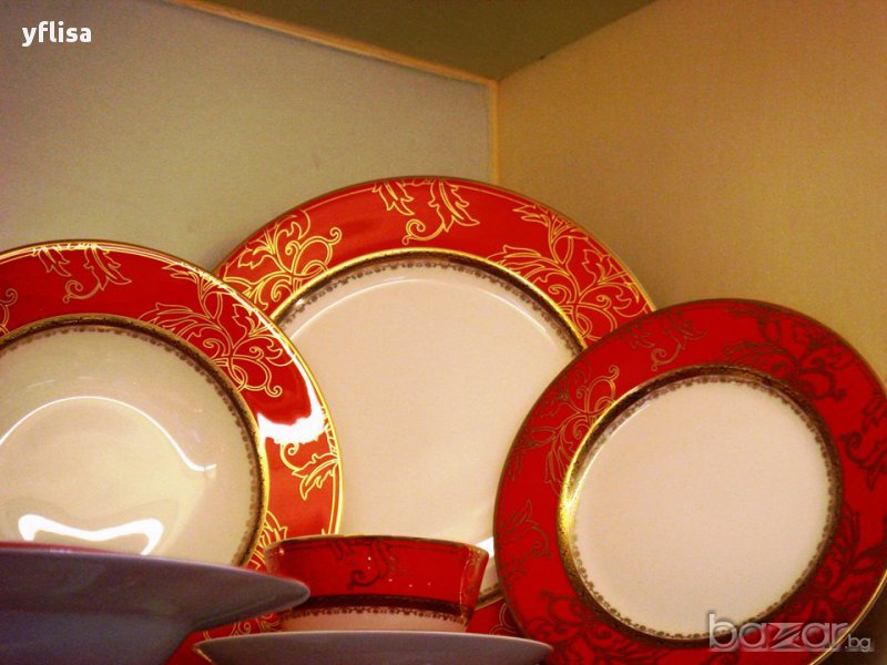 Сервиз за хранене "СТРАСТ" - кралско червен цвят със златна подглазурна декорация и гравиран кант.