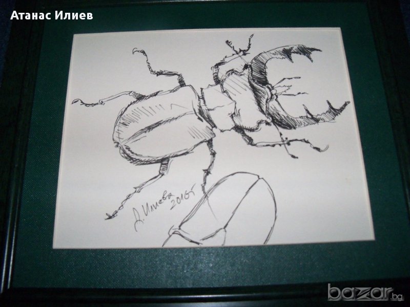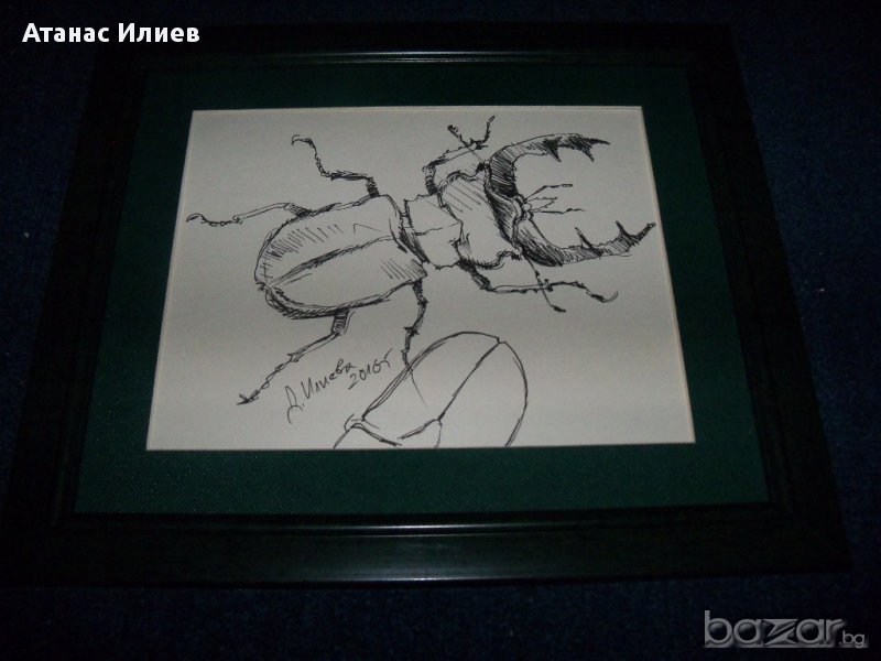 "Бръмбар рогач" графика от художничката Десислава Илиева. Размери с рамката27х23см. Рамката е без стъкло. Авторката е завършила специалност сценография, ученичка на известните видински художници Чавдар Петров и Цветан Тимотеев.